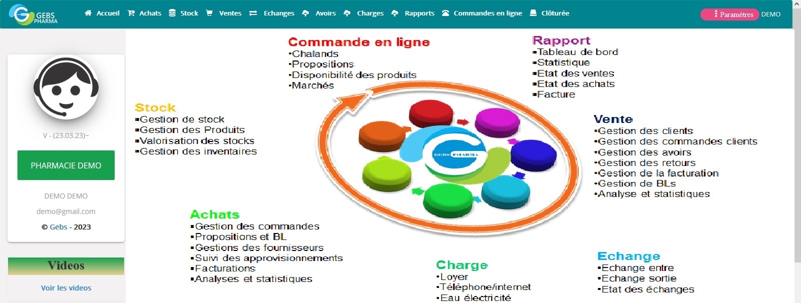 - GEBSPHARMA est installé localement sur votre PC. De plus, il est accessible depuis n'importe quel ordinateur ou appareil mobile connecté à Internet, Vous offrant ainsi la flexibilité de travailler où que vous soyez. vous pouvez ainsi passer vos commandes ou consulter Votre stock, votre recette, crédit client... en temps réel, où que vous soyez et à tout moment